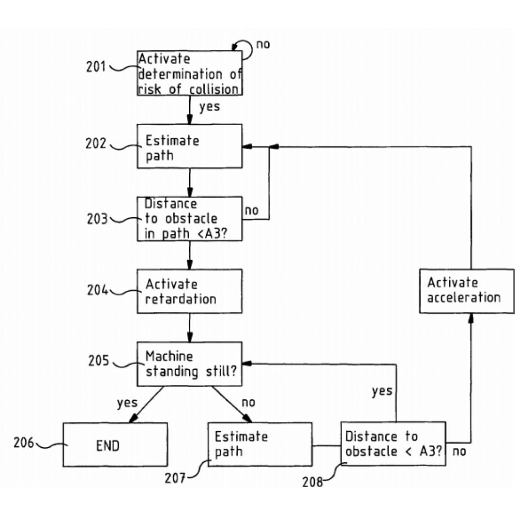 An example of an autonomous vehicle patent is Australian Patent 2012337399 titled “Method and system for driving a mining and/or construction machine”. This invention, from the Swedish company Epiroc, prevents a machine (eg. a mine truck) from colliding by retarding the machine before the machine collides. Below is an exemplary method: