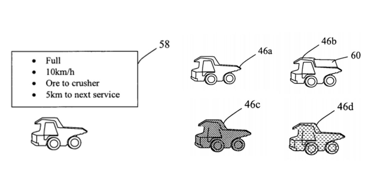 The core subject matter of the patent is that the identifier (mine vehicle) has the appearance of a mine vehicle and simultaneously displays the status information within that identifier by its appearances. Accordingly, one can discern whether the vehicle is empty or partially full, whether it is travelling (is it travelling TO a pick-up location or FROM) and the speed that it is travelling (by different colours).